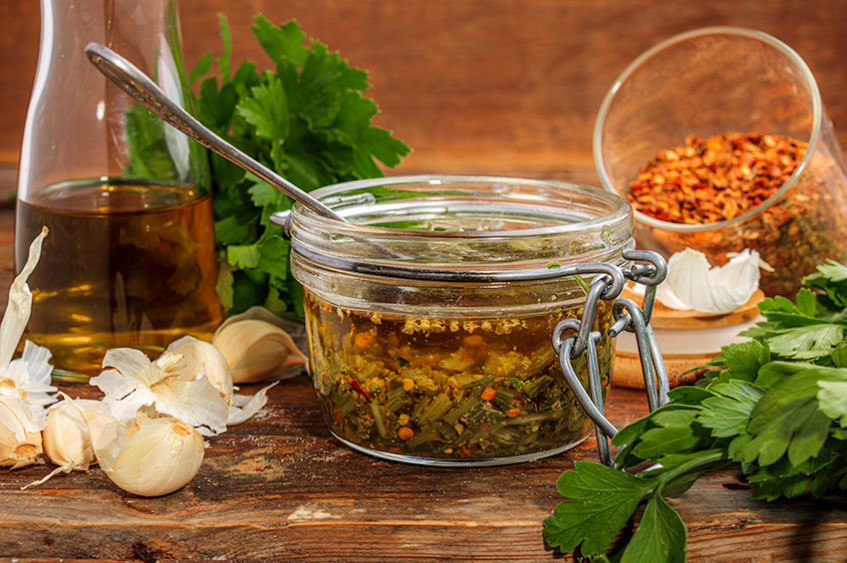 Свеж, пикантен и пълен с аромат – Чими Чури е един от най-емблематичните сосове на Южна Америка. В тази версия придаваме неочаквана дълбочина, като използваме лакто-ферментирали дръжки от магданоз – те носят леко киселинна свежест и пробиотичен характер. Това е истински пример за zero waste готвене – ароматен, здравословен и устойчив сос, който обогатява всяко ястие.
