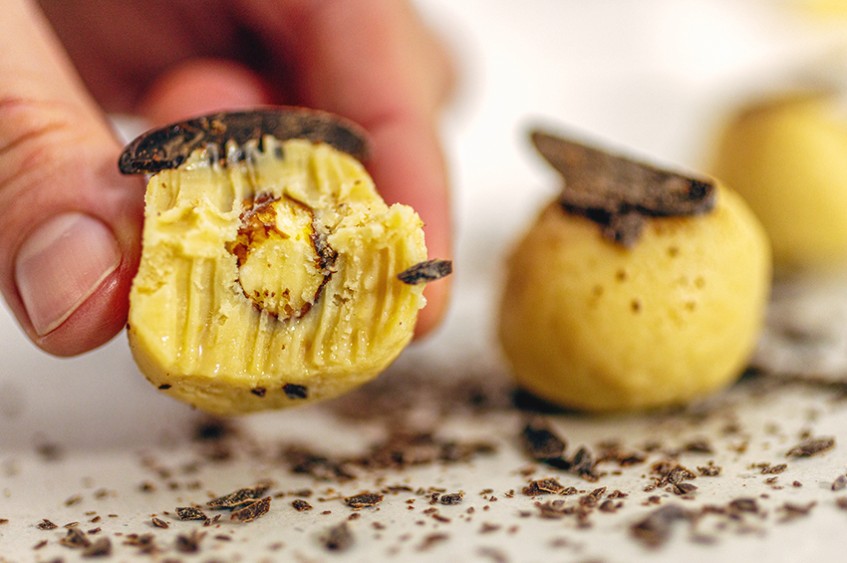 Оформете сместа на бонбони като поставяте по един лешник в сърцевината. Поръсете с настърган шоколад и съхранявайте в хладилника, за да са твърди.