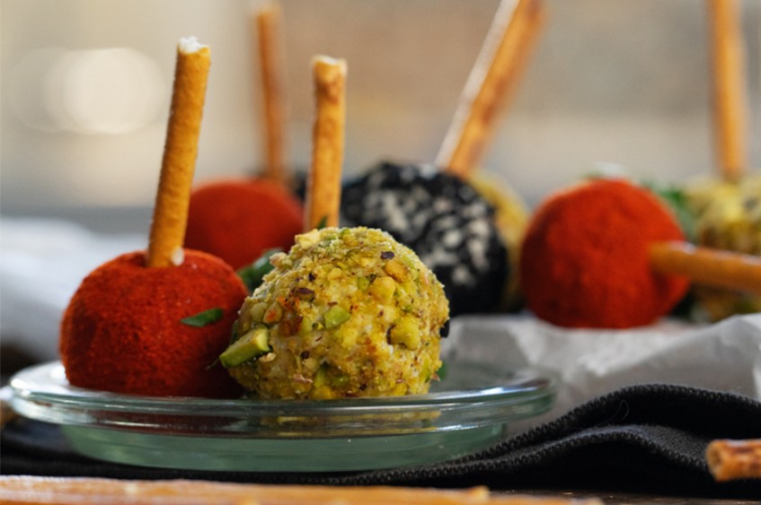 Оваляйте бонбоните в шам-фъстък, червен пипер, нигела или магданоз. По желание можете да сервирате бонбоните с по една забодена солета в тях.