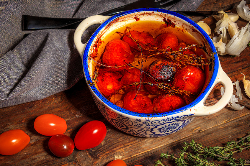Техниката „confit“ произхожда от френската кухня и първоначално е била създадена за съхранение на меса през зимата. Днес обаче я използваме и за зеленчуци, за да постигнем максимална сладост, сочност и гурме вкус.