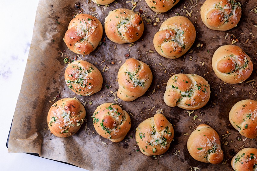 От всяко парченце направете фитил, който вържете на хлабав възел. Поставете го в подготвената тава. Оставете по няколко пръста разстояние между хлебчетата, за да не залепнат докато се надуват. Оформете всички топчета по този начин.