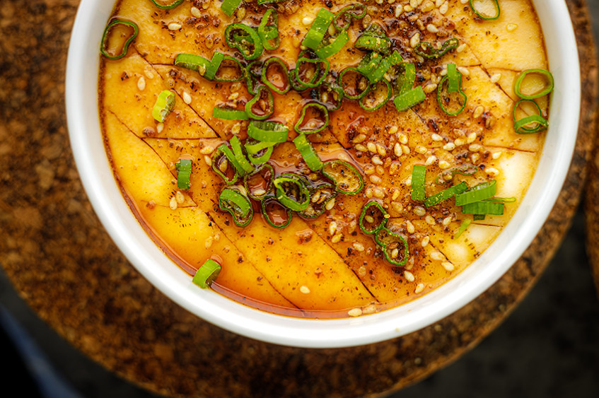 С помощта на 0малко ножче нарежете получилия се фин крем на ромбчета и полейте със соев сос и сусамово олио, поръсете пресен лук и фурикаке.