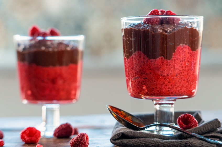 Разпределете равномерно количество от кремовете в подходящи чаши и оставете в хладилника да се охладят. Украсете с малини и кокос по желание.