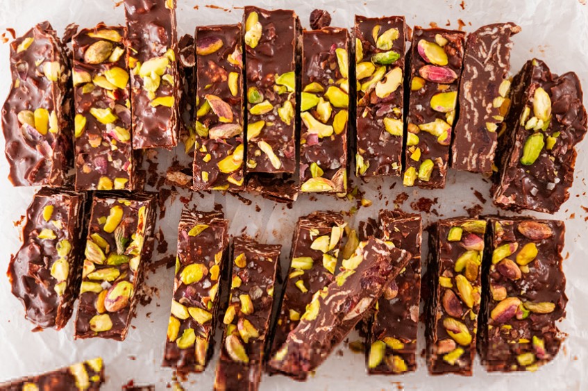 Застелете подходящ размер тава с хартия за печене и излейте сместа. Заравнете я с лъжица и я поръсете с начупен шам-фъстък и едра сол на кристали.