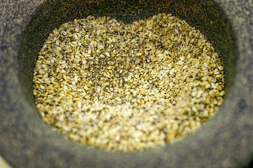В подходящо на размер хаванче сипете захарта и я смелете леко. Добавете изпечения и охладен сусам и намачкайте, докато не се отвори още по-силен аромат на сусам. Добавете солта, смляното атсуобуши и комбу и разбъркайте.