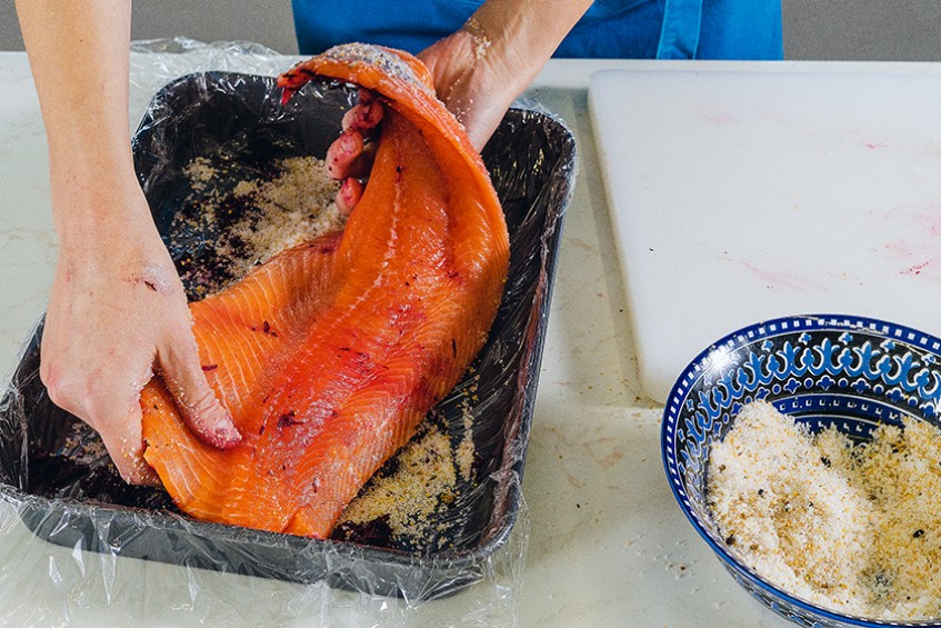 Вземете подходяща на размер тава и я застелете с прозрачно фолио. Оставете голям аванс на фолиото, за да можете да опаковате филето по-късно. Сложете сьомгата в покритата с фолио тава. Поръсете равномерно едната страна на филето с половината от микса подправки, захар и сол и внимателно масажирайте с ръце. Отгоре поръсете с половината от настърганото цвекло и леко натиснете с ръце. Обърнете филето и повторете операцията.