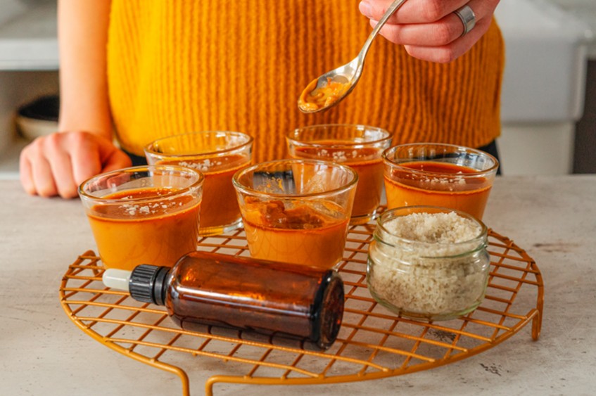 Загрейте фурната на 160°С без вентилатор и подгответе дълбока тава за печене на водна баня. Пригответе 5 стъклени чашки в които ще печете крема.
