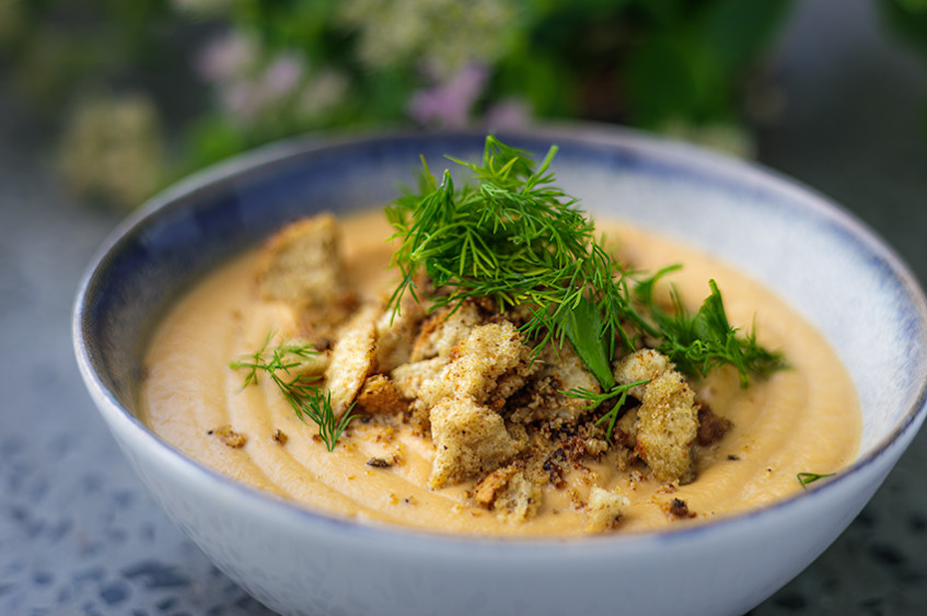 Копринено гладка, деликатна и пълна с аромат — тази крем супа от карфиол съчетава меката сладост на лука и целината с топлите цитрусови нотки на печен кориандър и семена от резене. Финалната поръска от златисто пангратато от хляб с квас добавя контраст и хрупкавост, а свежият копър внася леко билково докосване. Това е ястие, което показва как с внимание към техниката и детайла дори най-обикновените зеленчуци могат да се превърнат в изискано комфортно изживяване.