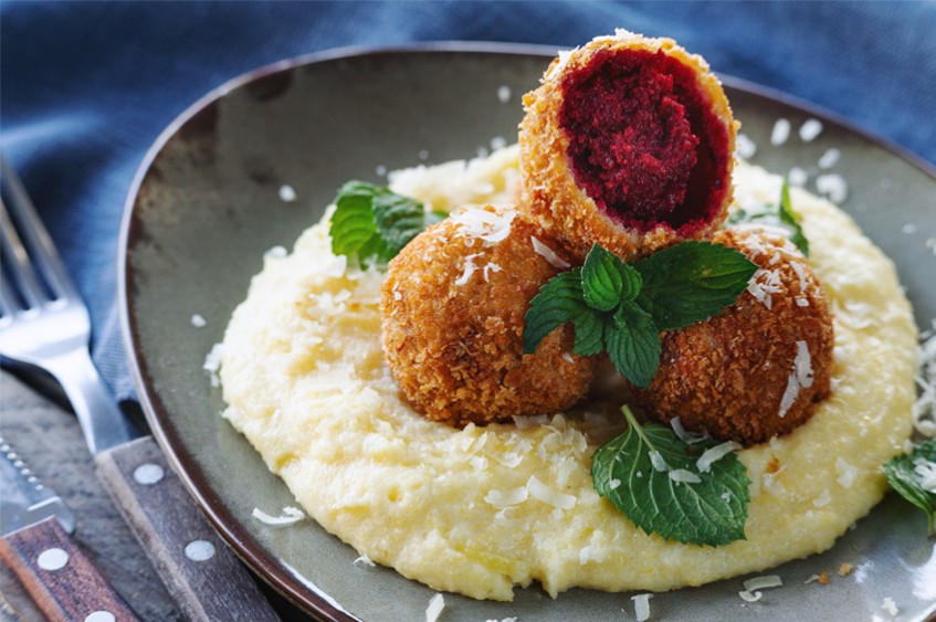 Направете топчета от сместа от цвекло с големина на бонбон и ги оваляйте първо в галета, после в яйце, а за финал в панко или отново в обикновена галета. За по-дебела и по-хрупкава коричка може да ги оваляте още веднъж в яйце и още веднъж в галета за финал.