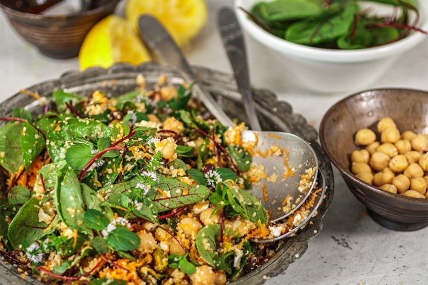 Направете дресинга като смесите солта, пипера и канелата и ги разбъркайте в лимоновия сок. Прибавете меда и зехтина и разбъркайте.