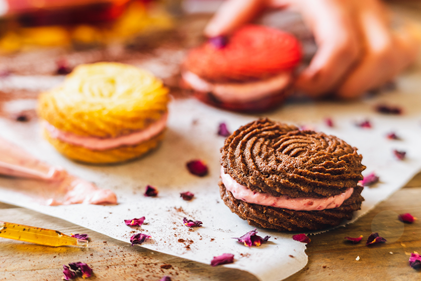 Хрупкави и ефектни бисквити, които не изискват много чакане и печене. Могат да се направят в най-различни цветове, както и можете да импровизирате вкусовете на крема.