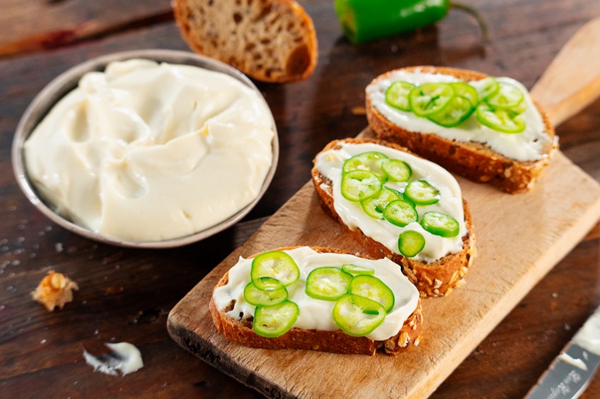 За да стане още по-гъста използваме не мляко или вода, а аквафаба - водата от сварен нахут или друго бобово. Тя е богата на естествен лецитин, което е веществото, отговорно да се получи майонеза. Подсилваме действието му с още допълнителни естествени емулгатори като тези, които се съдържат в чесъна и синапа. Et voila, майонеза без яйца!