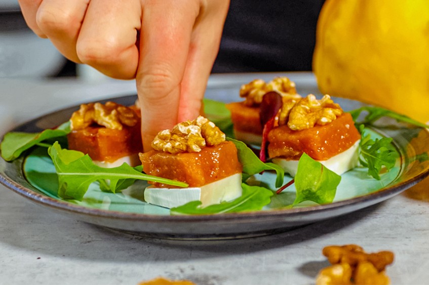 Сервирайте върху парченце сирене с една орехова ядка за разкош.