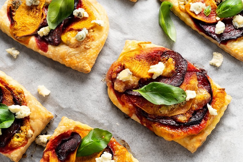 Натрошете синьото сирене и поръсете малко върху тестото. Притиснете го добре, за да не изпада. Отгоре подредете от картофите и цвеклото и прехвърлете във фурната. Печете докато тартите станат златисти (това ще отнеме около 30-40 минути).