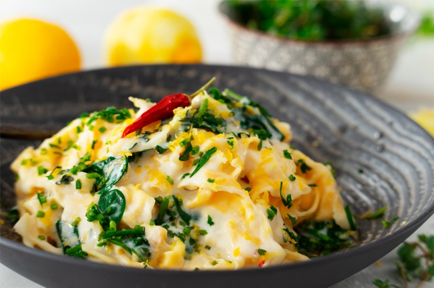 Прехвърлете пастата в купа и прибавете соса. Разбъркайте и сервирайте пастата украсена с лимонова кора и мащерка, поръсена с лимонов сок.