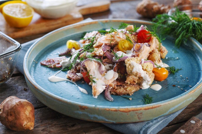 След като зеленчуците и сьомгата са готови, сглобете ястието. Разпределете зеленчуците в индивидуални чинии и поръсете с нарязани чери доматки. Начупете изпечената сьомга на едри парчета и ги подредете върху зеленчуците. Поръсете с йогурт сос и накъсан копър и сериврайте.