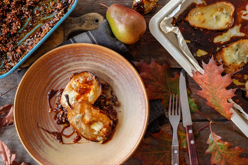 Извадете крушите от фурната и сервирайте докато са още топли върху гранолата и поръсете със соса, който се е отделил при печене.
