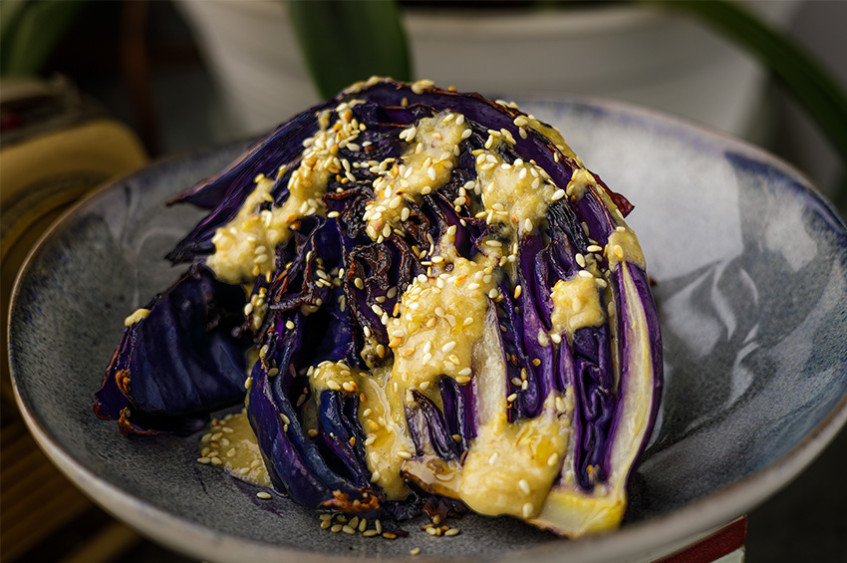 Изключително лесна и легантна рецепта за печено червено зеле с японски гома (сусамов) дресинг. Дълбокия „виолетов“ цвят на печеното зеле и леко сладкия му вкус се развиват най-добре при висока температура. Започваме с кратко запичане в тиган и довършваме във фурна, за да получим карамелизирани ръбове и сочна вътрешност. Комбинираме с гома дресинг – японски сусамов сос изобилсващ от умами, фина киселинност и копринена текстура, достатъчно лек, за да полепне по горещото зеле, без да го утежнява.