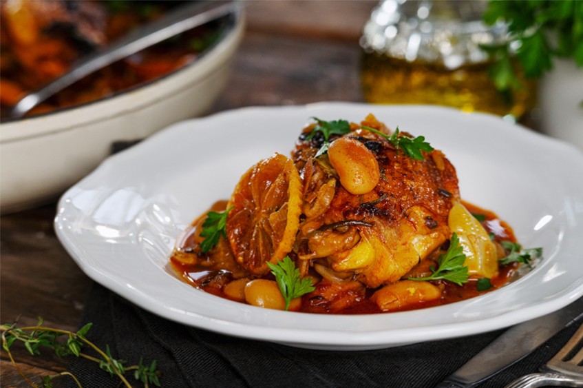 Прехвърлете тигана във фурната и гответе около 50–60 минути или докато поне един пръст от течността се изпари и кожата на пилето се препече.