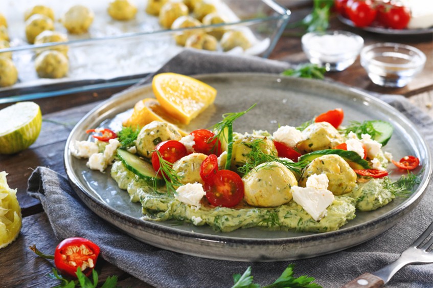 След като кюфтенцата са готови извадете тавата от фурната. Сервирайте ги с подготвения крем от авокадо, гарнирани с прясна краставица и чери доматки, поръсени със сирене, билки и нарязана люта чушка и няколко резена лимон отстрани.