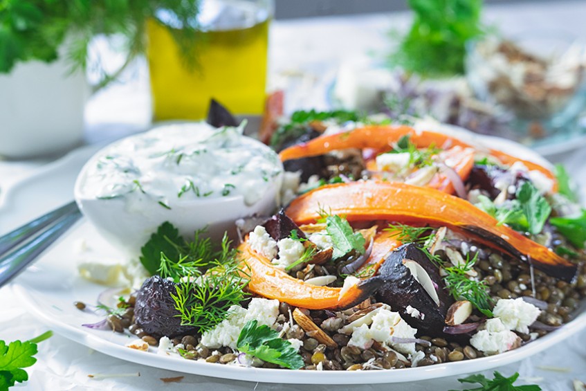 Когато лещата е вече готова я отцедете от водата и я прехвърлете в широка чиния. Подредете отгоре печените зеленчуци и поръсете с лук, сирене и бадеми.