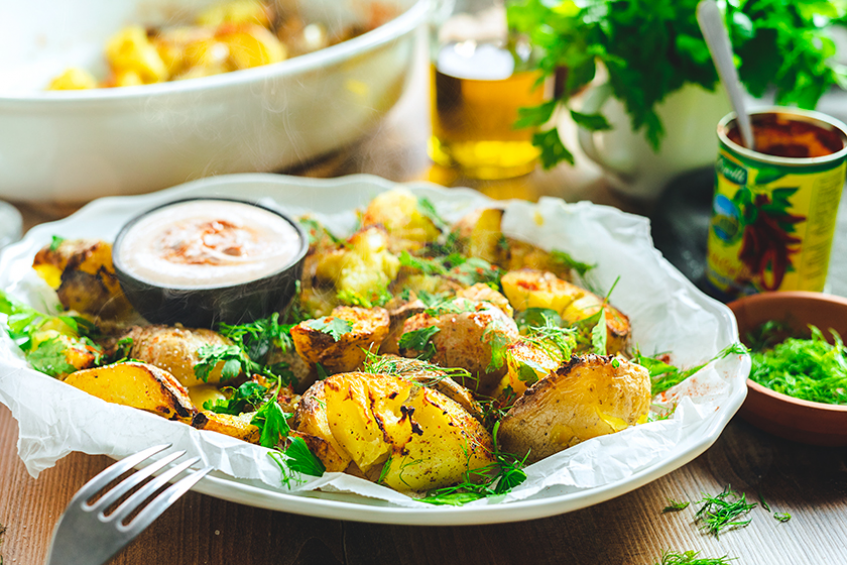 Когато картофите са готови извадете тавата от фурната и ги подредете в широка чиния. Поръсете ги с пипер и накъсан магданоз и копър и сервирайте с хариса соса.