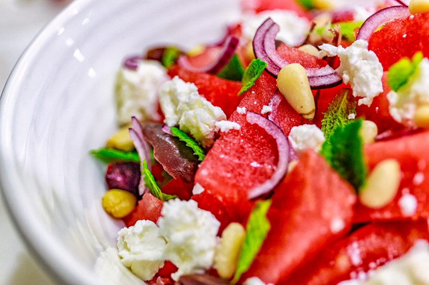 Който обича да похапва сладко и солено (грозде със сирене, диня със сирене), ще се влюби в тази салата. Изпробвана върху много хора, всеки един от които прави тази рецепта част от неговото меню. Салатата става още по-свежа и разхлаждаща, ако охладите добре всички компоненти за нея предварително.