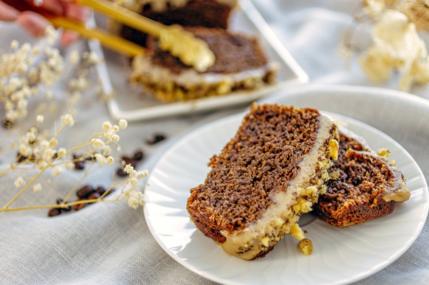 Тексурата на този кейк е леко влажна и сочна, все едно сте използвали невероятни кулинарни похвати, за да я направите точно такава. Ароматът му е чист и ефирен, на току що изпечени орехи и кафе.