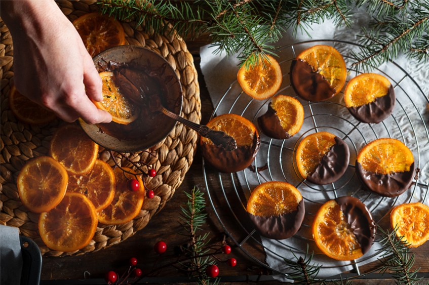 След като резенчетата изсъхнат по желание можете да ги потопите в шоколад: стопете 300 g натурален шоколад на водна баня и потопете резенче по резенце портокалите в него. Подредете върху решетка и оставете за 30 минути да се стегне шоколада.